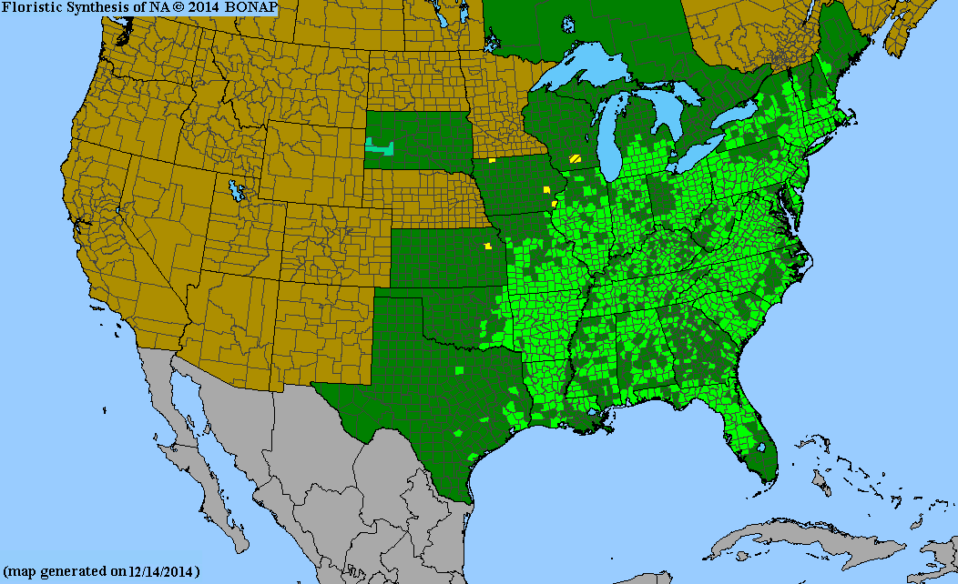 BONAP Native Range Map (bright green indicates county native, dark green indicates state native).