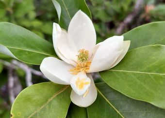 The sweetbay magnolia is an evergreen or deciduous tree, depending on the mildness of the winter climate where it grows. It tends to be multi-stemmed. It produces beautiful, creamy-colored, vanilla-scented flowers in May-June that give way to bright seed pods in Fall. The sweetbay magnolia usually reaches 20–30' tall by 15' wide. Best in full to part sun in wet to moist soil. Can tolerate wet and waterlogged soils and even periodic drought. A semi-evergreen tree on Maryland's Eastern Shore, with dark green leaves above and silver undersides. A medium to fast grower. Prized for its flowers, its neat attractive foliage, and its fast growth, it can be a good choice for specimen plantings, woodland edges, foundation plantings, and patios.