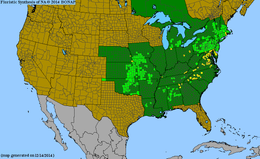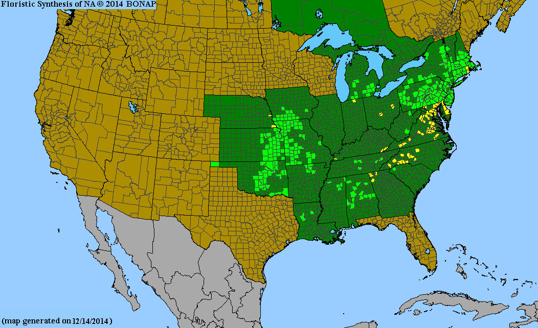BONAP Native Range Map (bright green indicates county native, dark green indicates state native)