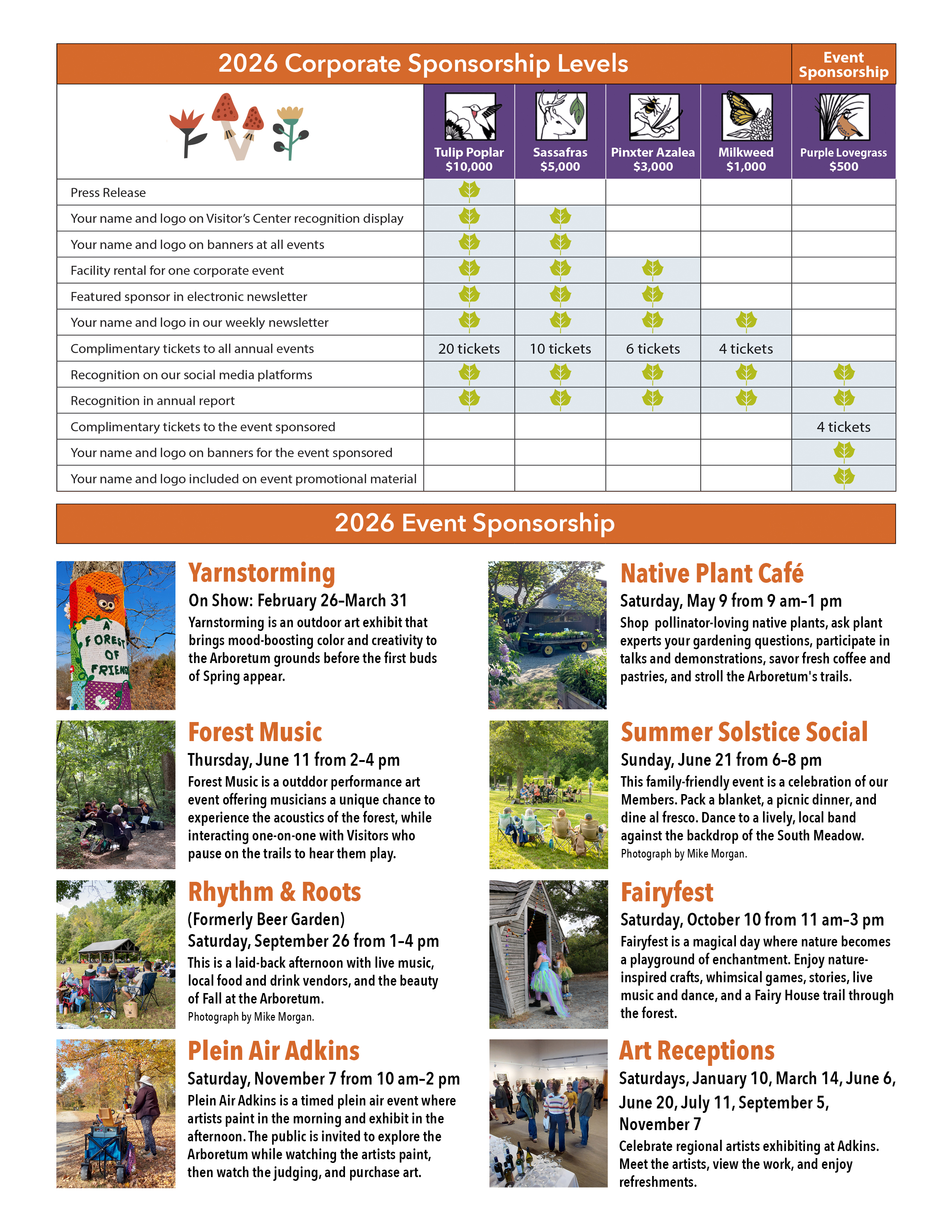 The Sponsorship Program provides the opportunity for businesses to maximize their marketing exposure and showcase their brands and products to these Arboretum constituents and visitors.